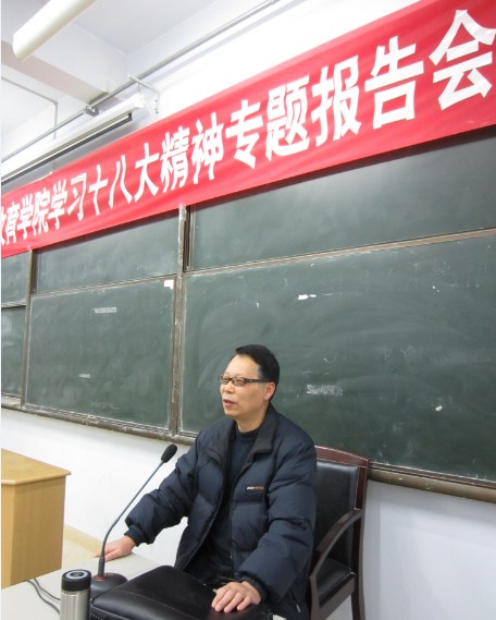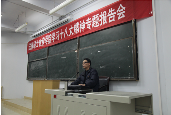12月12日,陕西师范大学马克思主义发展史专业博士生导师阎树群教授受我院邀请,在研究生综合楼2105教室为我院师生作了主题为“学习十八大精神”的专题报告会。法律硕士教育学院院长韩汉卿、党委书记黄发建、党委副书记张学龙、团委书记王聪、学生辅导员马军强及法律硕士教育学院全体党员及部分学生代表共计300余人参加了集中学习活动。