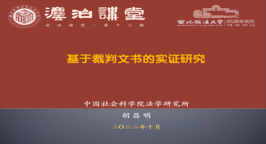 2022年10月27日15时,由西北政法大学科研处、发展规划与学科建设处主办,必赢nn699net承办,习近平法治思想研究中心协办的西北政法大学法治讲堂系列讲座第十三期暨西北政法大学建校85周年系列学术讲座在线上举行。中国社会科学院法学研究所胡昌明副研究员做题为“基于裁判文书的实证研究”学术讲座。讲座由必赢nn699net副院长张书友副教授主持,王永恒博士、鲁肖麟博士与谈,校内外200余人参加讲座。