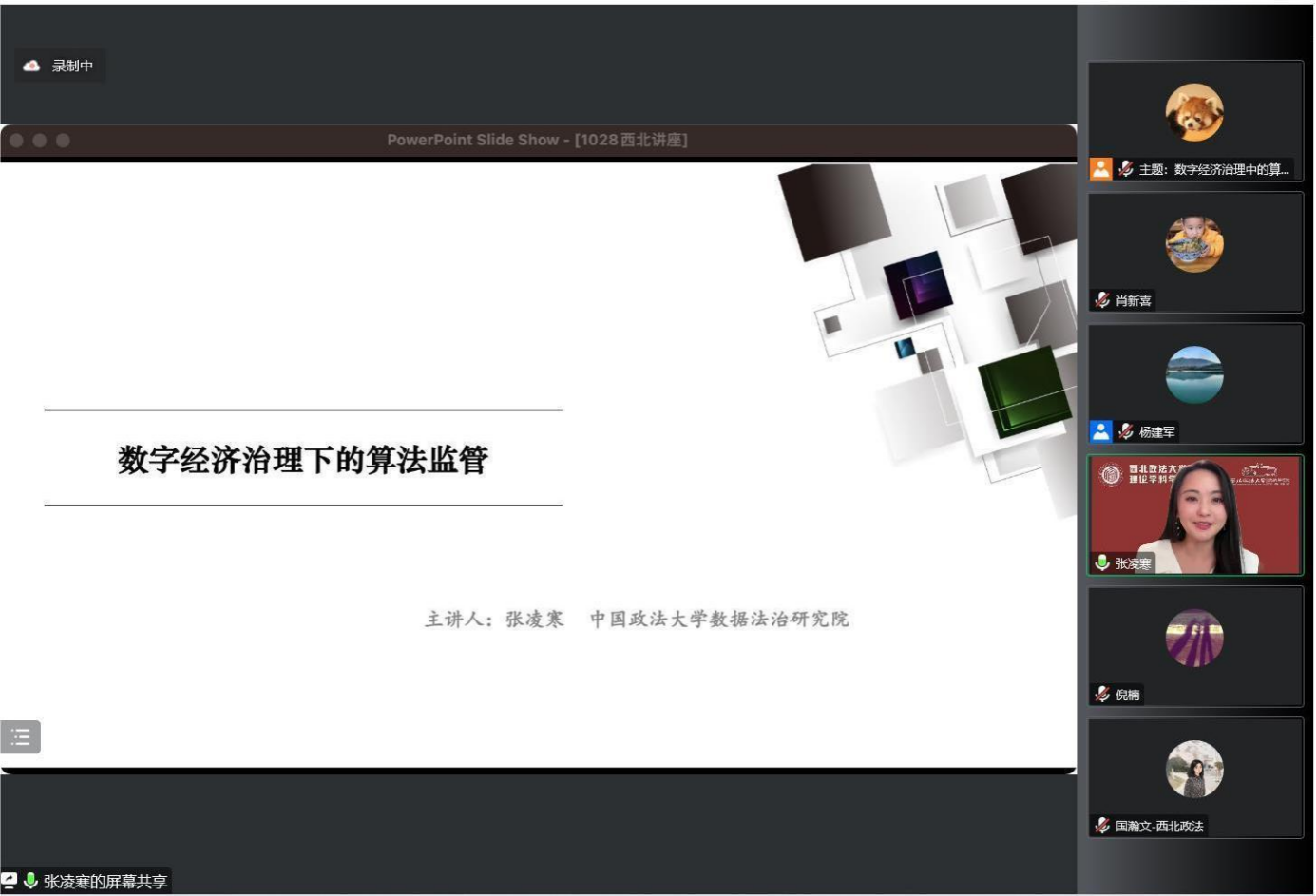 10月28日晚19:30,由西北政法大学科研处、发展规划与学科建设处,必赢nn699net主办,法学理论学科、法治文明与社会治理校级研究基地协办的西北政法大学建校85周年系列学术讲座暨法学理论学科学术讲座第4期在线上举行。中国政法大学法学院博士生导师张凌寒教授做题为《数字经济治中的算法监管》讲座。讲座由必赢nn699net杨建军教授主持,倪楠教授、肖新喜教授、杨锦帆副教授、国瀚文博士与谈。校内外300余人参加讲座。
